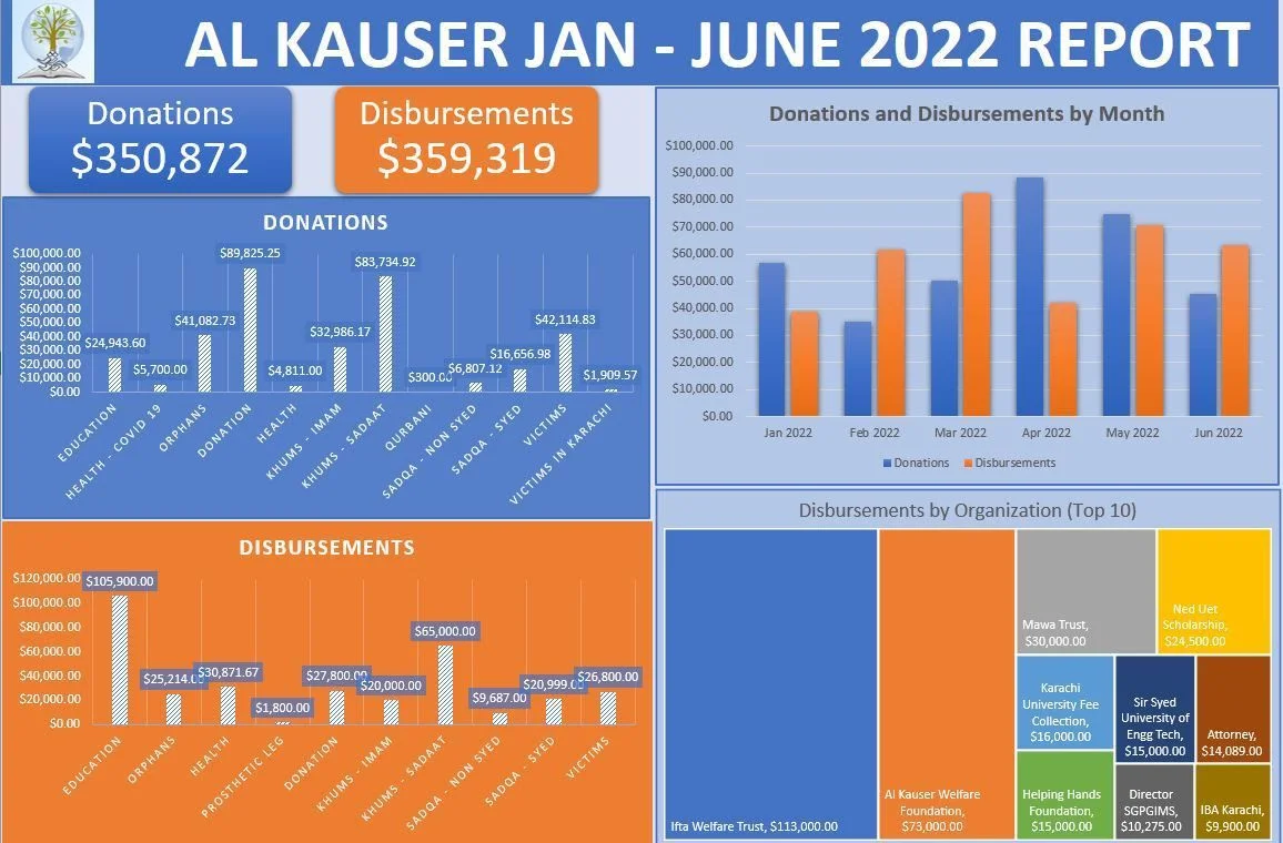 We are deeply grateful to Almighty Allah and our donors for supporting Al-Kauser’s mission to uplift the community through education, family support, and development. Alhamdulillah, in H1 2022, Al-Kauser raised $350,872 and disbursed $359,319. Donations increased by 18% compared to last year, while disbursements grew by 12%, reflecting our sustained growth beyond the COVID-19 period.